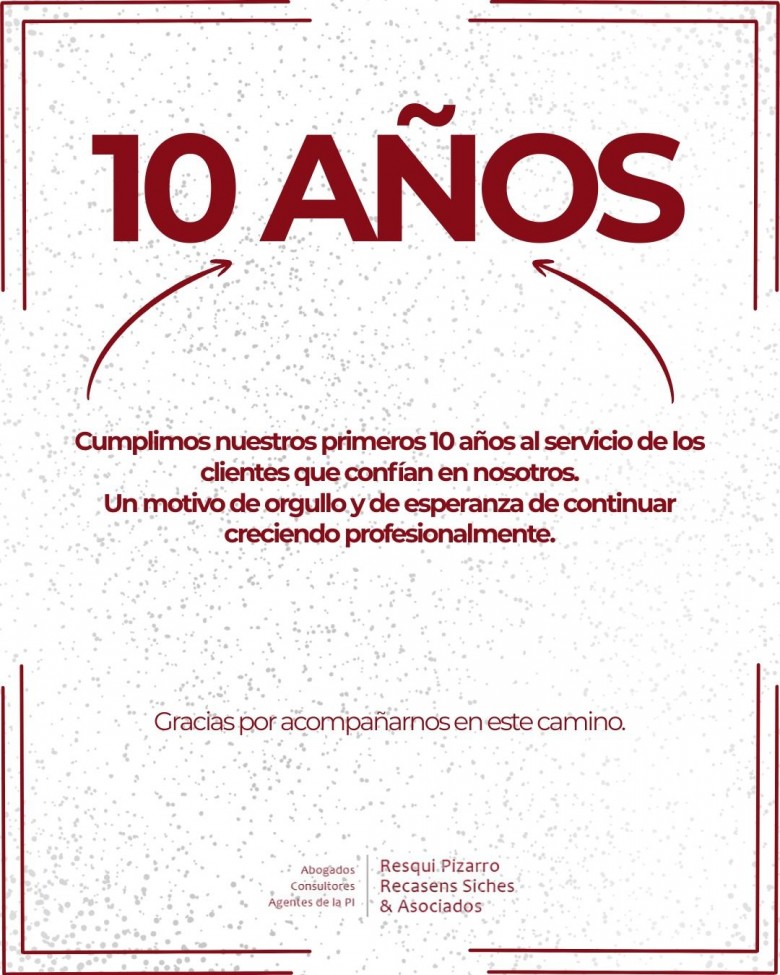 El estudio Resqui Pizarro ‑ Recasens Siches & Asociados se complace en celebrar sus diez años de trayectoria profesional. Desde su fundación, el equipo ha brindado asesoramiento jurídico, consultoría y servicios de propiedad industrial con una combinación de juventud y experiencia, construida sobre la práctica heredada de generaciones anteriores.