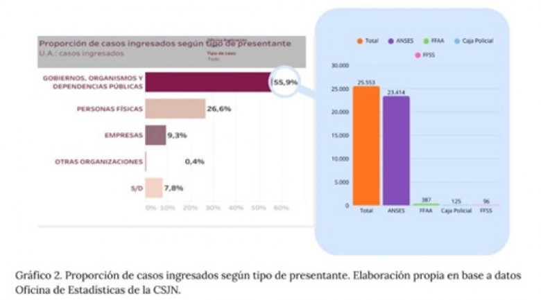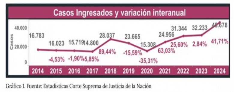 El Foro de Estudios sobre la Administración de Justicia (FORES) publicó el trabajo La industria del juicio. El Estado Nacional como la mayor fábrica de litigios del país, una investigación desarrollada por los Dres. Marcelo de Jesús y María de los Ángeles De Seta Acosta, que toma como base el Anuario Estadístico 2024 de la Corte Suprema de Justicia de la Nación, en el que se observa un récord histórico: 45.678 recursos (41% más que en 2023), impulsados principalmente por el sector público (56% del total), cuyo principal insumo es el previsional (jubilados y pensionados).