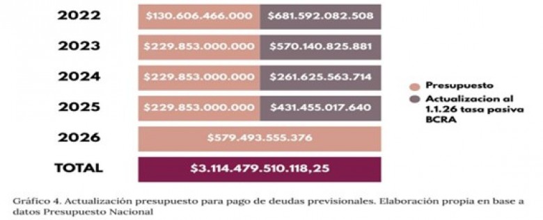 Sobre el pasivo conocido, tomando los presupuestos nacionales 2022-2026 actualizados a tasa pasiva, asciende a más de tres billones de pesos ($3.114.479.510.118,25) o 2.170 millones de dólares (dólar oficial a $1.435). Esta cifra no refleja la totalidad del pasivo estatal, sino únicamente el período 2020-2024.