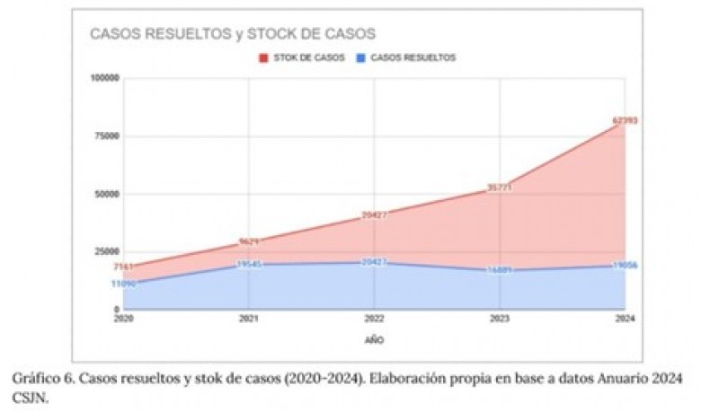 Esta situación genera dos grandes peligros institucionales: el desdibujamiento del rol institucional de la CSJN y un potencial (y enorme) desequilibrio para el pasivo de la economía del país. Con respecto al colapso institucional, se percibe que el total de recursos 2020-2024 es casi 150.000 y se pudieron resolver solo 87.000.