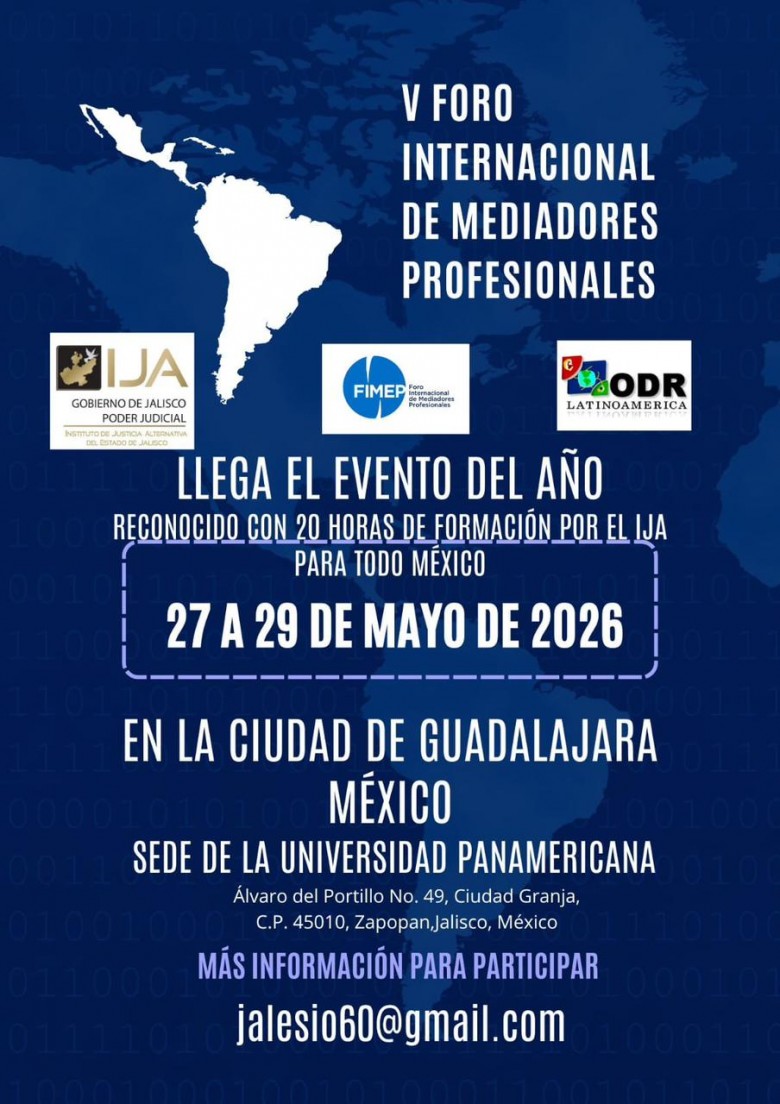 Del 27 al 29 de mayo de 2026, la ciudad de Guadalajara, México, recibirá a referentes de la mediación de América Latina y otras regiones del mundo en el marco del V Foro Internacional de Mediadores Profesionales, un encuentro de alto nivel académico y profesional que se consolida como uno de los eventos más relevantes del año en el ámbito de la resolución pacífica de conflictos.