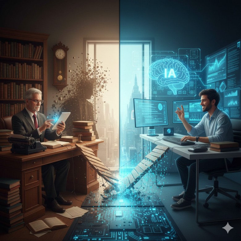 La IA generativa comprime décadas de curva de aprendizaje en semanas. Un abogado junior con dominio de herramientas digitales puede, en teoría, acceder a jurisprudencia, doctrina y modelos contractuales con una velocidad que antes requería años de práctica. El capital humano específico acumulado por los seniors, aunque valioso, enfrenta competencia asimétrica.