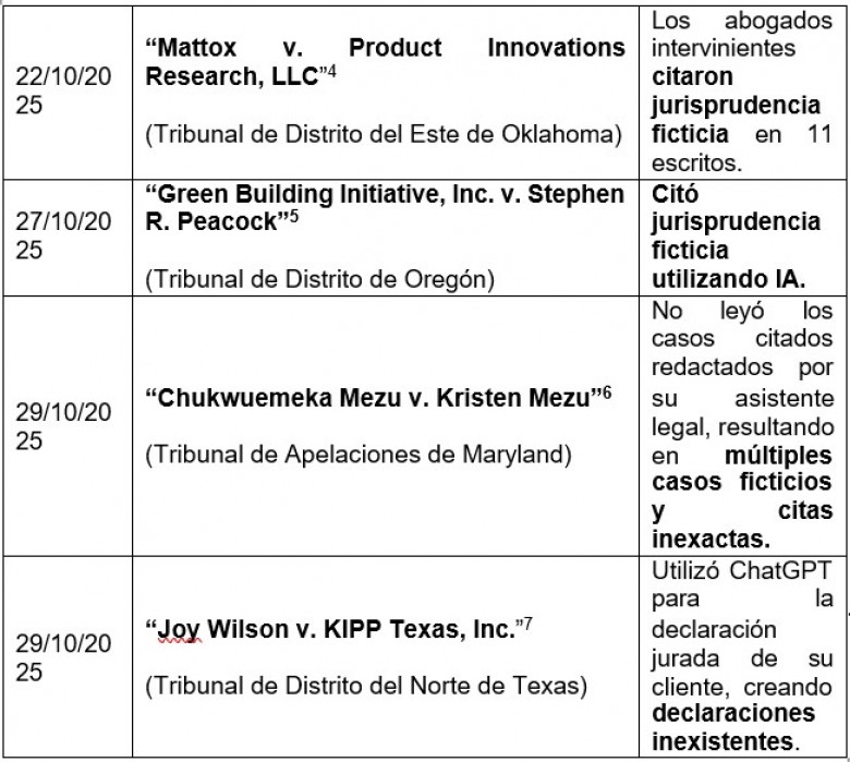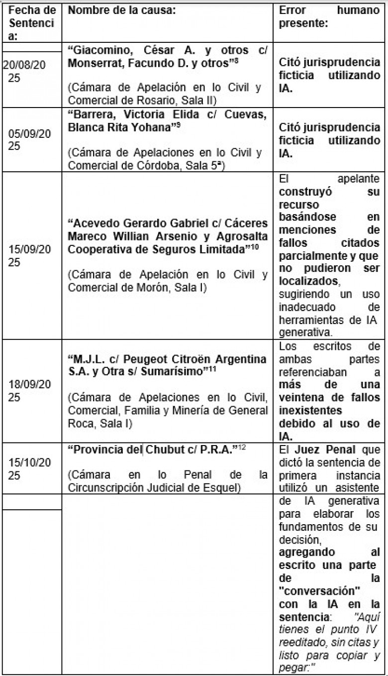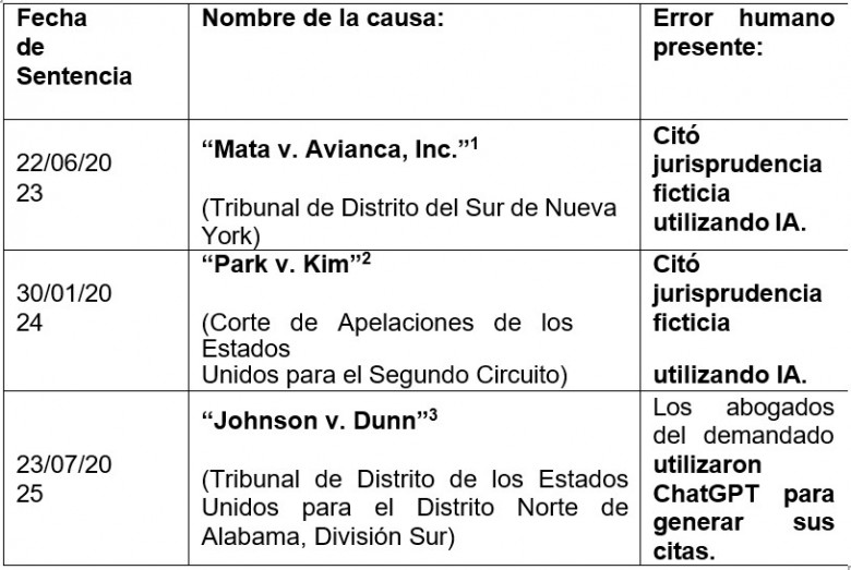 A continuación, con el propósito de reforzar la tesis de que el error no es tecnológico sino humano, se incluyen dos tablas que recopilan algunos de los casos judiciales hasta el momento en los Estados Unidos y en la Argentina, donde se utilizó inteligencia artificial de forma errónea.
