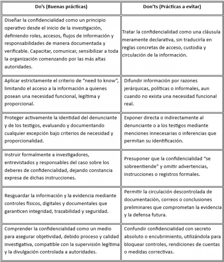 En síntesis, a continuación, expresamos qué hacer y qué no hacer respecto de la confidencialidad en una investigación interna:
