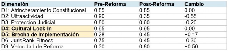 Causa: Conflicto entre cambio legal formal (D2 baja de 0.90 a 0.35) y cultura legal inmutable (D4 permanece en 0.95).