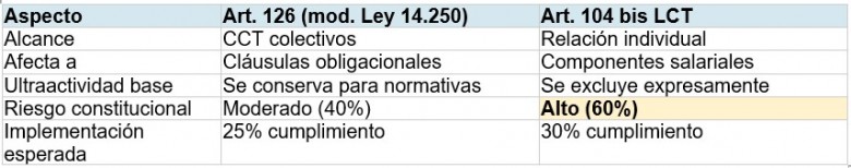 1. Art. 104 bis LCT: Permitir eliminación unilateral de componentes salariales podría violar "protección contra despido arbitrario" (despido indirecto salarial). Riesgo: 60%.