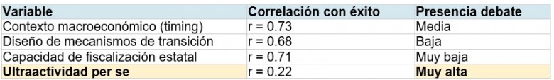 Interpretación: La ultraactividad como variable aislada tiene correlación moderada-baja (r = 0.22) con rigidez laboral medida por rotación de empleo formal. Variables como el diseño de transición y la capacidad de fiscalización tienen mayor poder predictivo sobre el éxito de reformas similares en otros países.