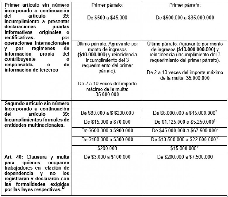 [12] En materia sancionatoria, además, se modificó el monto de los valores de bienes o servicios $20.000 a $200.000 para que proceda la clausura de 2 a 6 días del art. 40 de la Ley N°11.683.