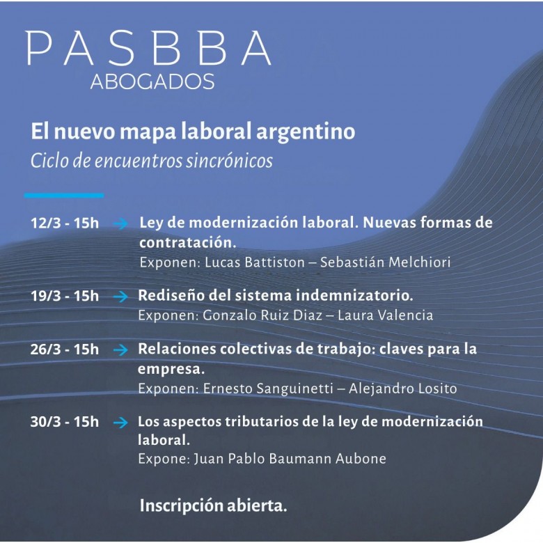 En un contexto de cambios estructurales en el régimen laboral argentino, PASBBA Abogados fuertemente posicionado en el ámbito laboral presenta “El nuevo mapa laboral argentino”, un ciclo de webinars gratuitos para analizar la reforma laboral con un enfoque práctico y orientado a la gestión empresarial. En cada módulo abordaremos los principales cambios normativos y sus efectos concretos, con espacio para preguntas e intercambio con sus especialistas.